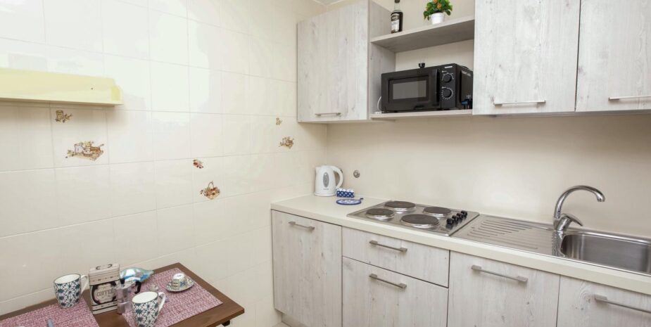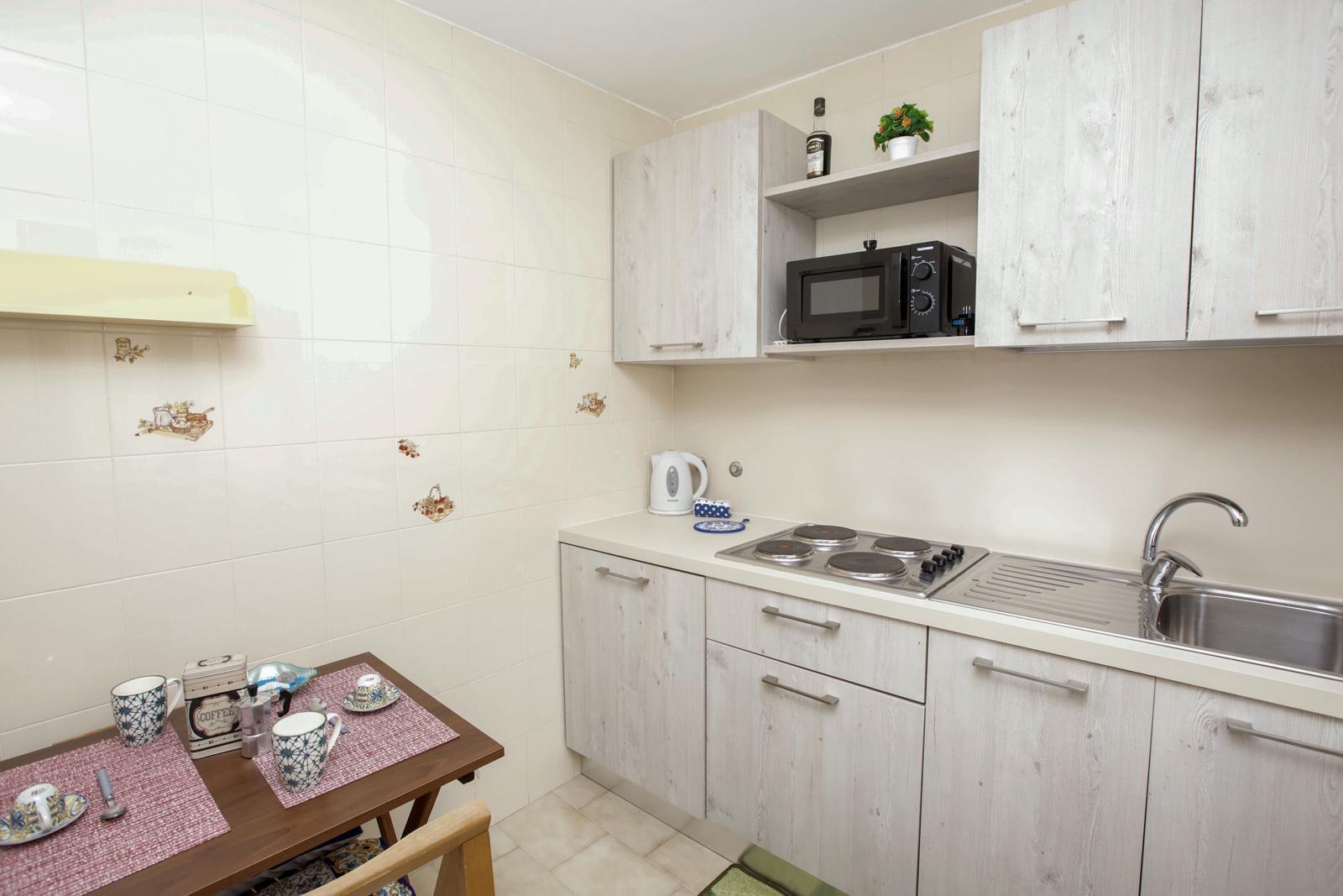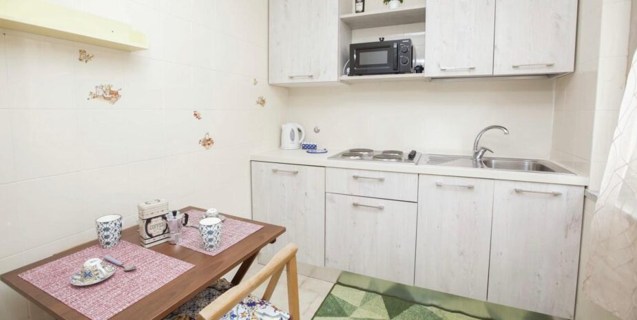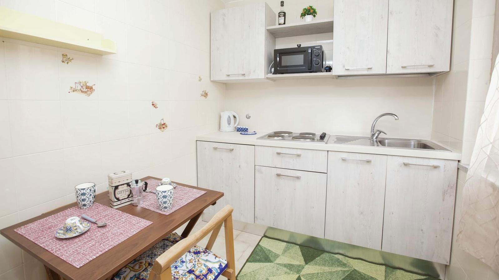 Ha una superficie di circa 25 metri quadrati ed è composto da una camera con letto matrimoniale, una piccola cucina ben attrezzata e un bagno; dispone di aria condizionata/riscaldamento e servizio Wi-Fi gratuito.  È un appartamento molto tranquillo e luminoso con un letto matrimoniale (misura italiana: 160 cm). La piccola cucina è dotata di quattro fornelli elettrici, un piccolo frigorifero, una caffettiera italiana (Bialetti) e un bollitore elettrico. Il bagno è dotato di lavabo, WC e doccia completamente chiusa.